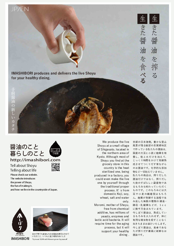 醤油の古式天然醸造方が姿を消そうとしている現代に【もろみ】を「今しぼり醤油」(もろみ)として復活して、さらに「食べる醤油」という新しい形で食卓にご提案するものです。